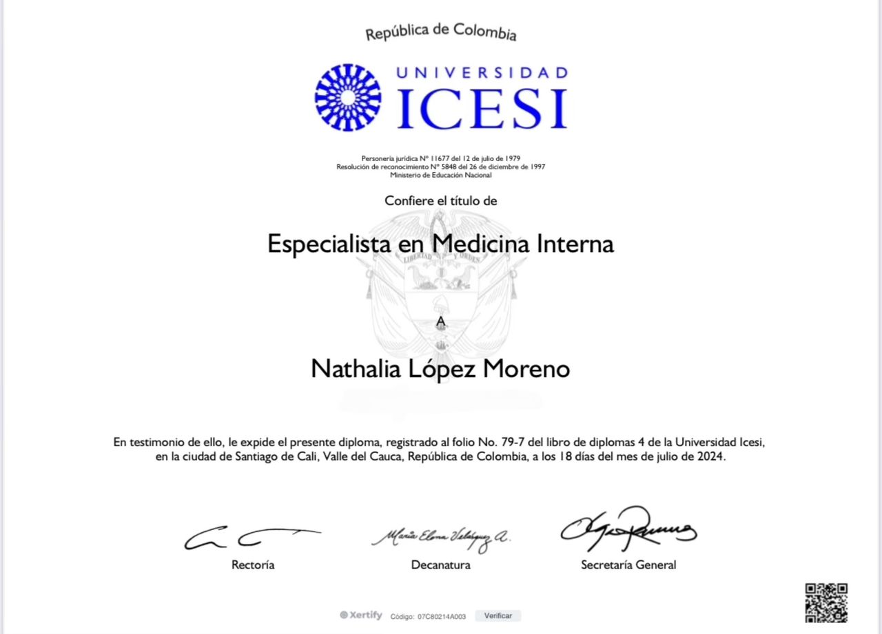 - Medico especialista en Medicina Interna - Universidad Icesi Cali